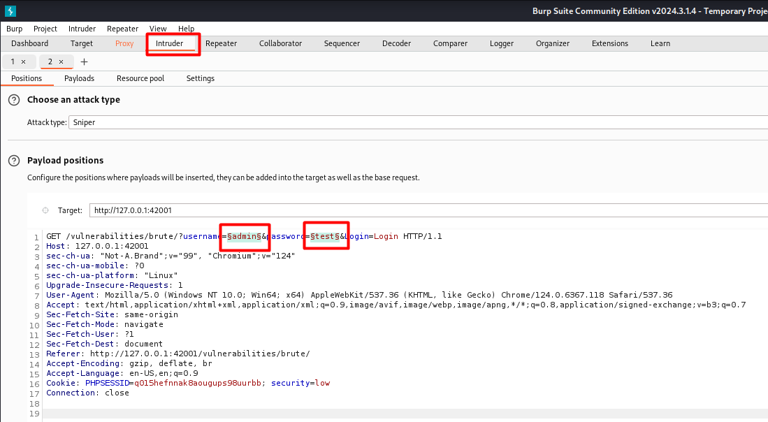 After attempting to log in, the request was intercepted by Burp Suite, allowing me to view and modify it. I then sent this request to the Intruder tool to prepare for the attack.
