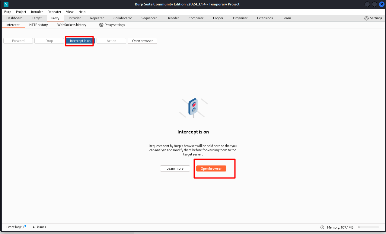 Burp Suite – I started Burp Suite and configured it as a proxy to capture and modify HTTP requests. I activated intercept mode and configured the browser to send all HTTP traffic through Burp Suite.