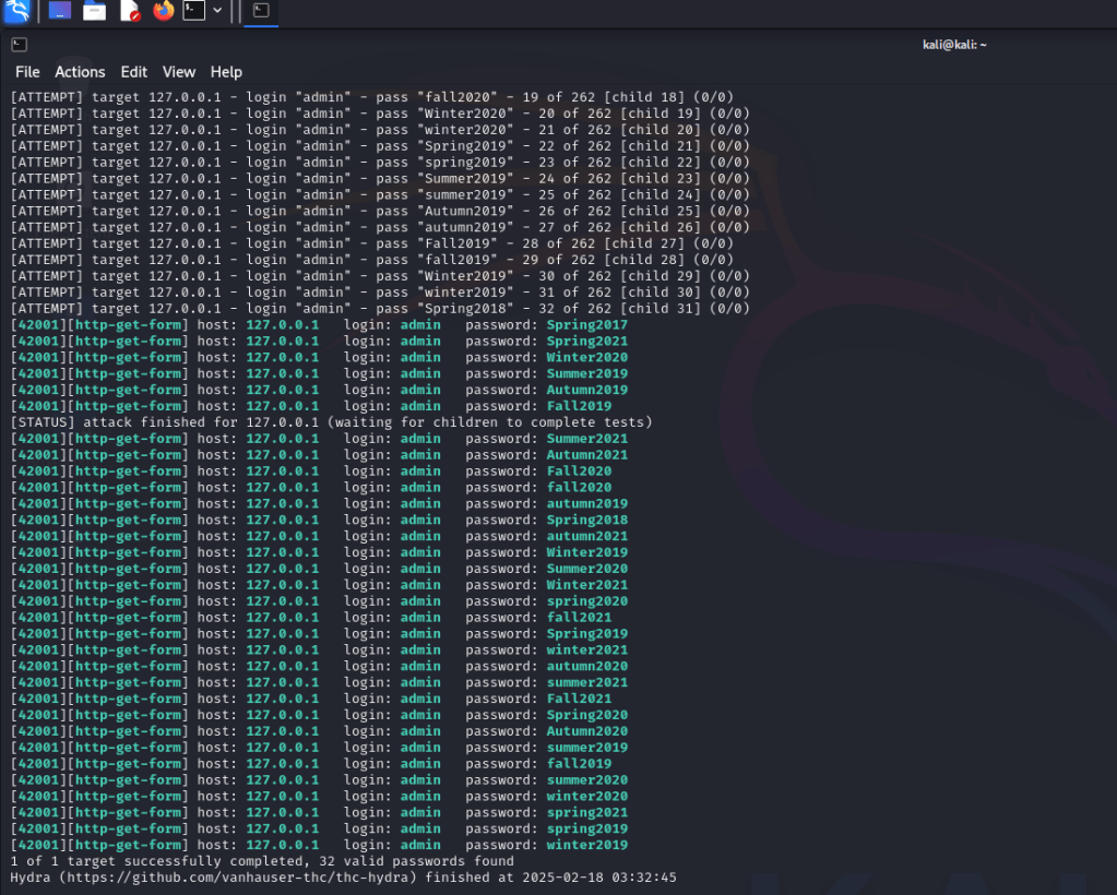 π Once Hydra found the correct password, it displayed it in the output, confirming the login credentials had been cracked successfully.